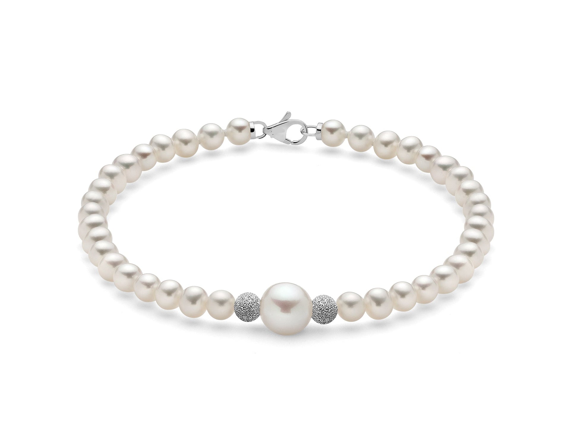 Bracciale di perle Oriente con sfere in oro bianco diamantate.
