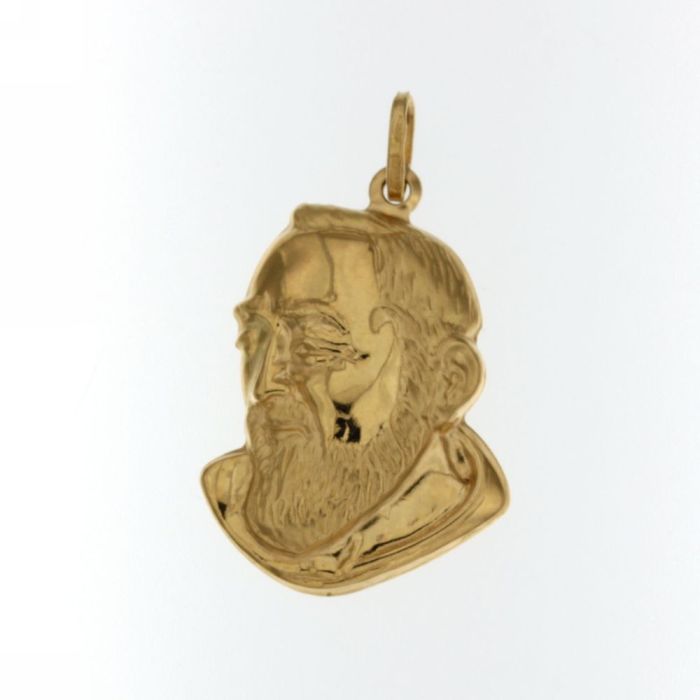 Pendente in oro giallo raffigurante la testa di Padre Pio, modello scatolato, finitura lucida e satinata