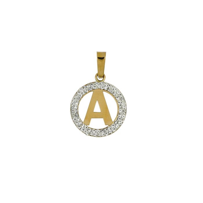 Pendente in oro giallo, lettera A in stampatello, con resina e zirconi bianchi, lucido