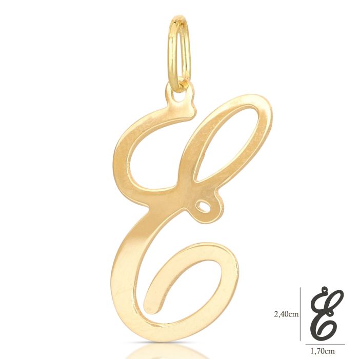 Pendente in oro giallo, lettera E in corsivo, lucido a lastra
