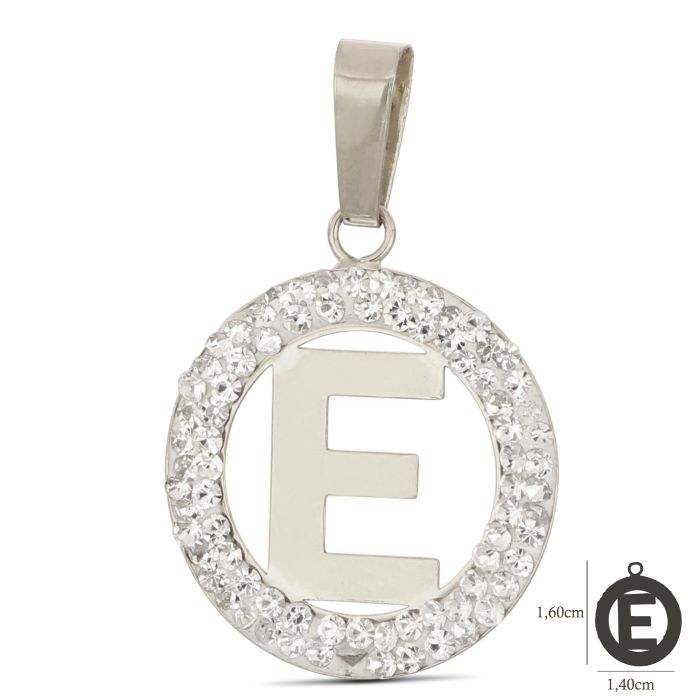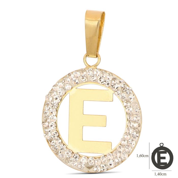 Pendente in oro giallo, lettera E in stampatello, con resina e zirconi bianchi, lucido