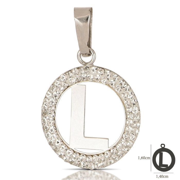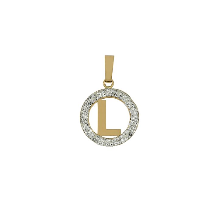 Pendente in oro giallo, lettera L in stampatello, con resina e zirconi bianchi, lucido