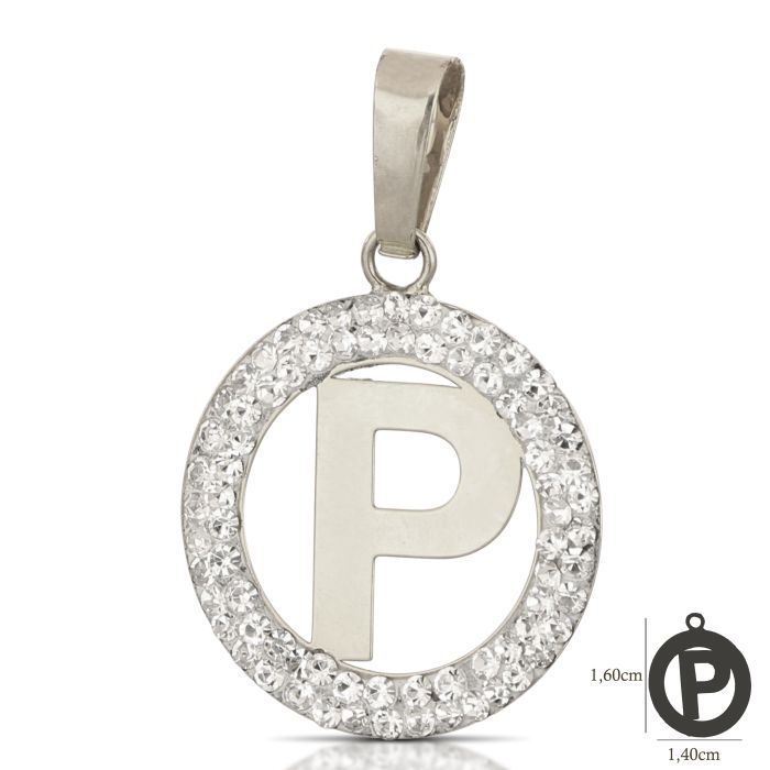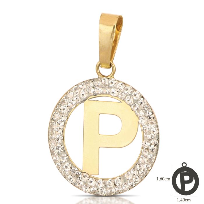 Pendente in oro giallo, lettera P in stampatello, con resina e zirconi bianchi, lucido